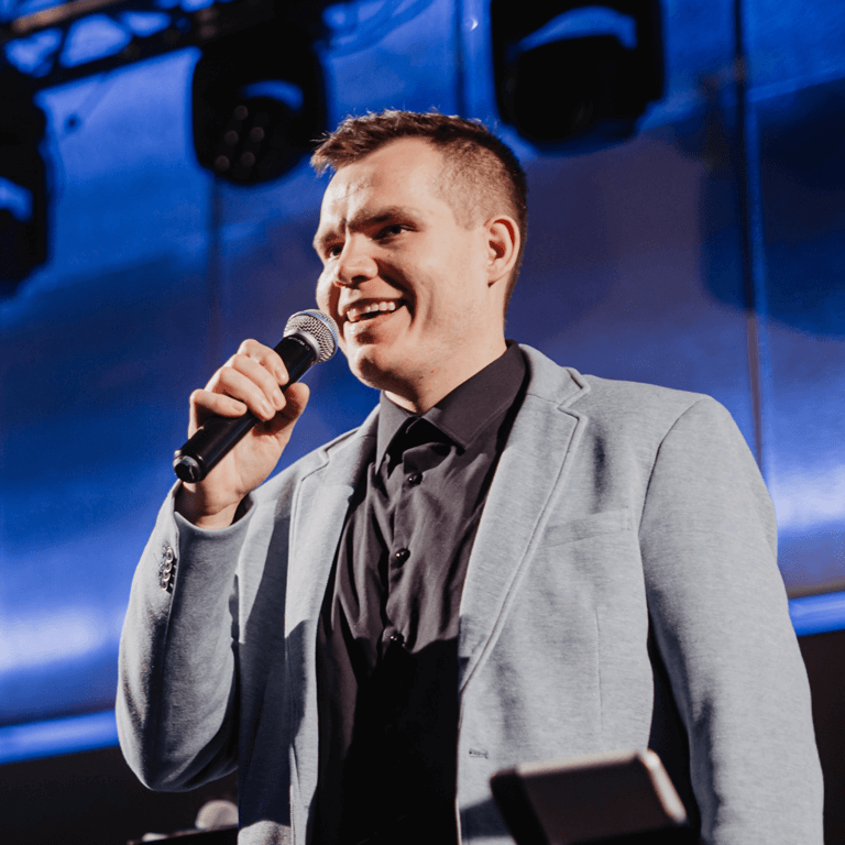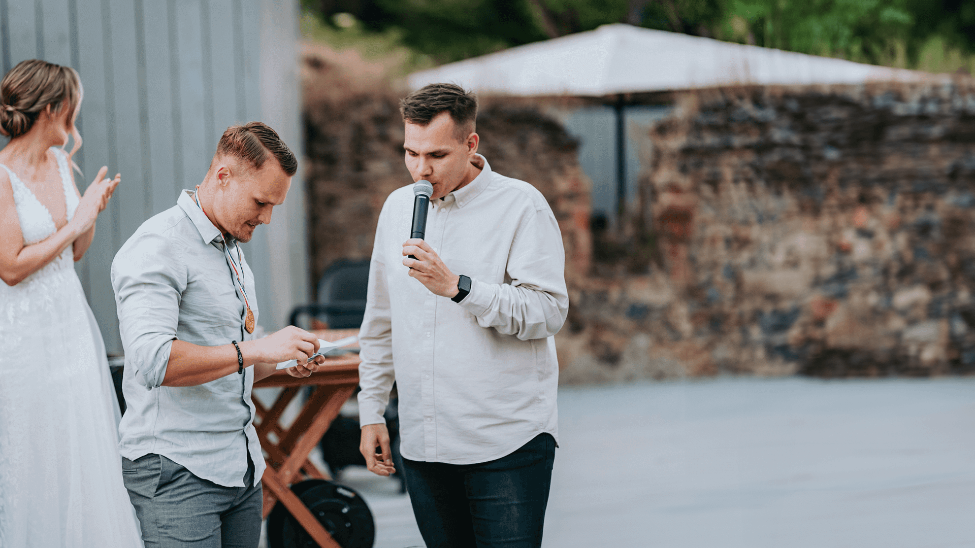 Během odpoledne začneme také ve vhodný čas pomalu rozjíždět zábavu a svatební hry. Společně si jich můžeme naplánovat dle vašeho gusta tolik, kolik jen budete chtít. Časově dopředu odhadnu, co je ideál. Miluju zábavu, snažím se do ni zapojovat i publikum, takže tohle je další z důležitých bodů v programu, za který rád nesu zodpovědnost. Jsem člověk, který se rozhodně nebojí mikrofonu, naopak, a věřím, že je to znát. Do všech her, které si společně zahrajeme, zapojím co nejvíce svatebních hostů.